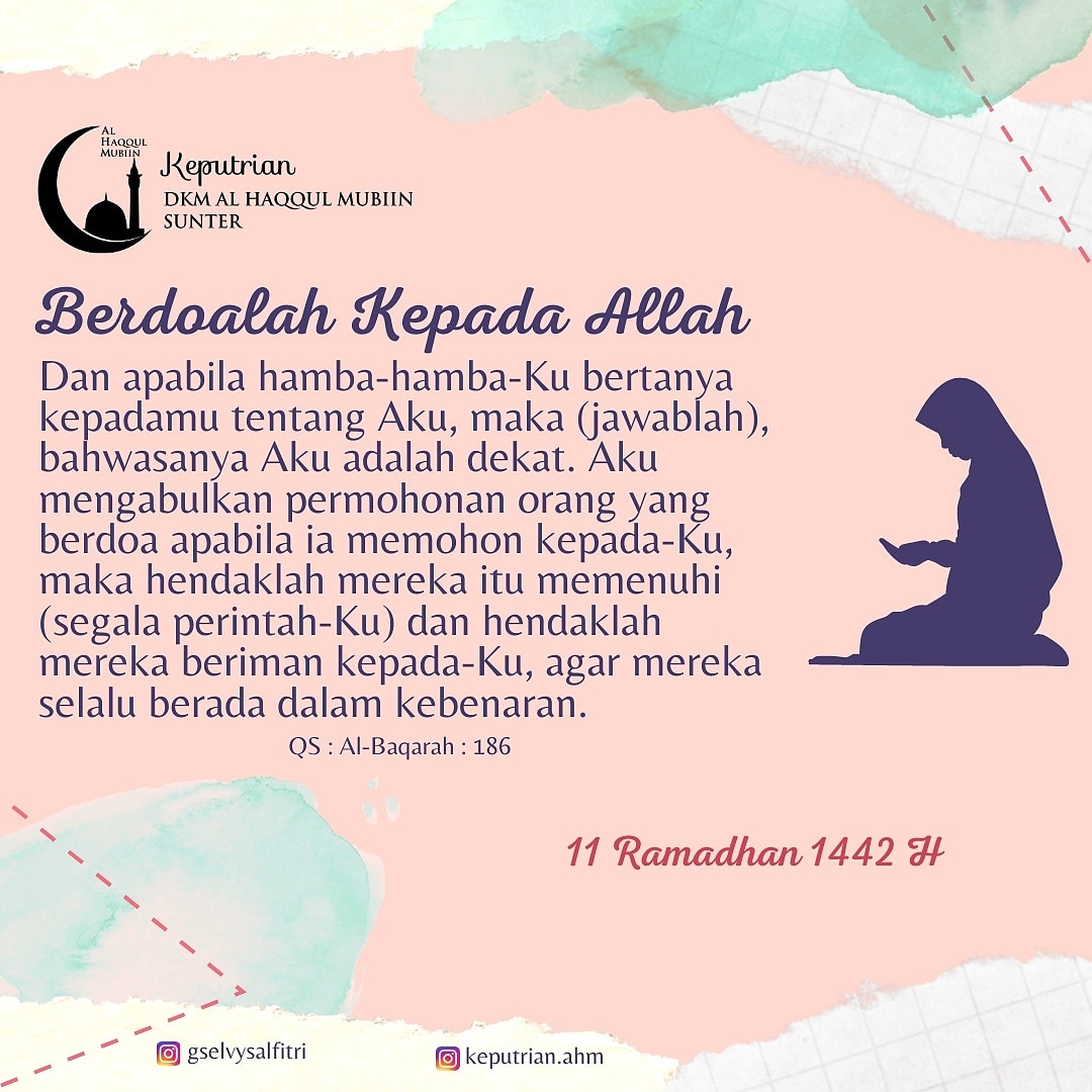 Dan apabila hamba-hamba-Ku bertanya kepadamu tentang Aku, maka (jawablah), bahwasanya Aku adalah dekat. Aku mengabulkan permohonan orang yang berdoa apabila ia memohon kepada-Ku, maka hendaklah mereka itu memenuhi (segala perintah-Ku) dan hendaklah mereka beriman kepada-Ku, agar mereka selalu berada dalam kebenaran.