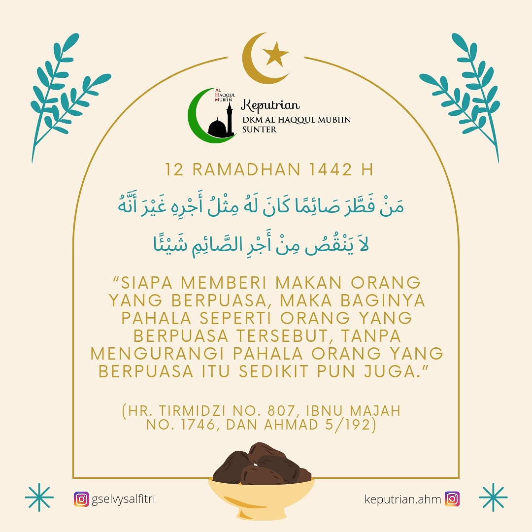 “Siapa memberi makan orang yang berpuasa, maka baginya pahala seperti orang yang berpuasa tersebut, tanpa mengurangi pahala orang yang berpuasa itu sedikit pun juga.” (HR. Tirmidzi no. 807, Ibnu Majah no. 1746, dan Ahmad 5/192)