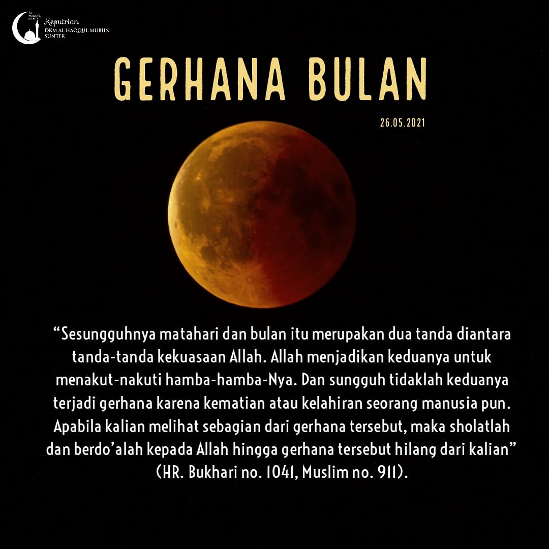 4 years ago Public“Sesungguhnya matahari dan bulan itu merupakan dua tanda diantara tanda-tanda kekuasaan Allah. Allah menjadikan keduanya untuk menakut-nakuti hamba-hamba-Nya. Dan sungguh tidaklah keduanya terjadi gerhana karena kematian atau kelahiran seorang manusia pun. Apabila kalian melihat sebagian dari gerhana tersebut, maka sholatlah dan berdo’alah kepada Allah hingga gerhana tersebut hilang dari kalian”