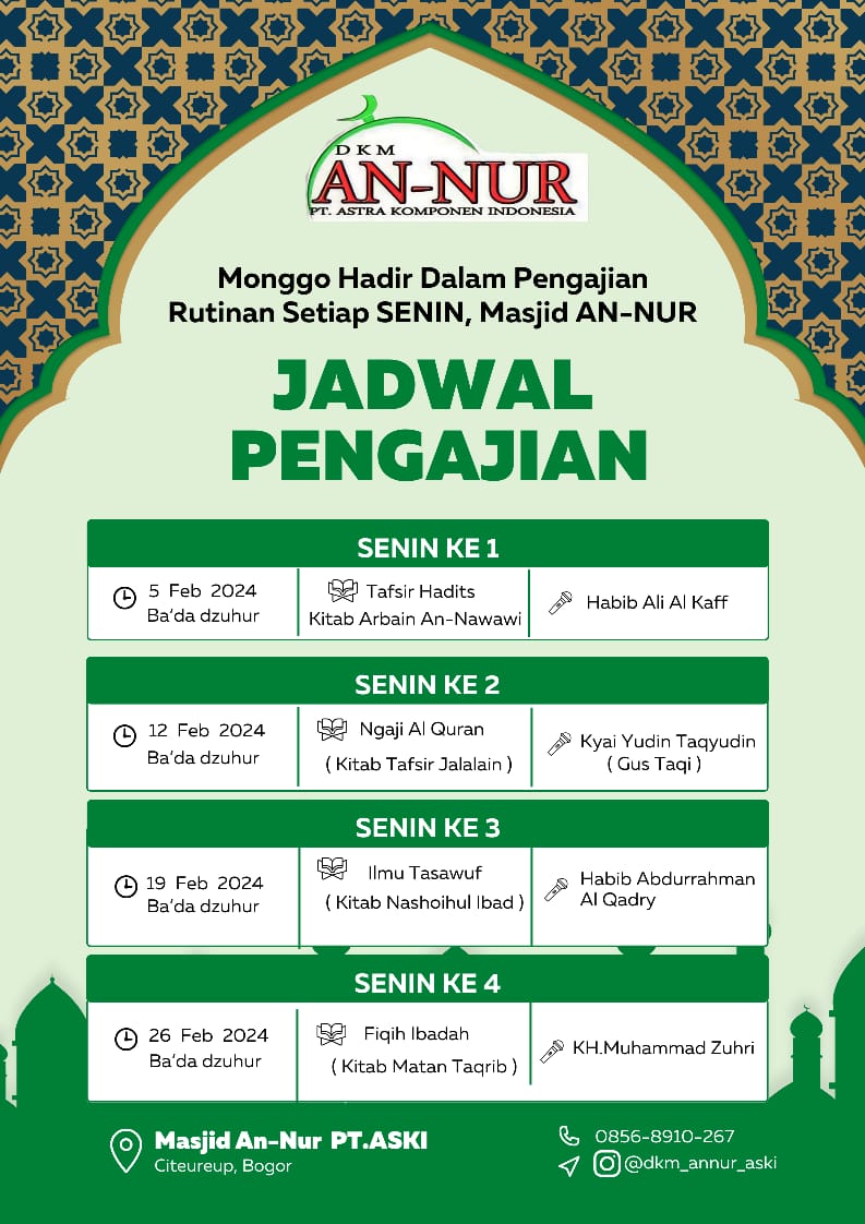 Berikut Jadwal Kajian Rutin setiap Senin Ba'da Dzuhur Masjid An-Nur PT.ASKI selama bulan *FEBRUARI 2024*