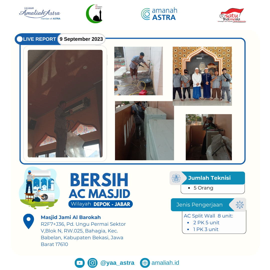 - 1 PK 3 unitTelah dibersihkan yang terletak di Masjid Al Barokah Babelan Bekasi Utara Kab. Bekasi, InshaAllah 350 jamaah akan mendapatkan manfaat dari kesejukan hembusan AC saat beribadah Sholat 5 waktu.