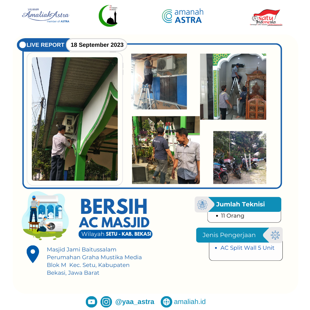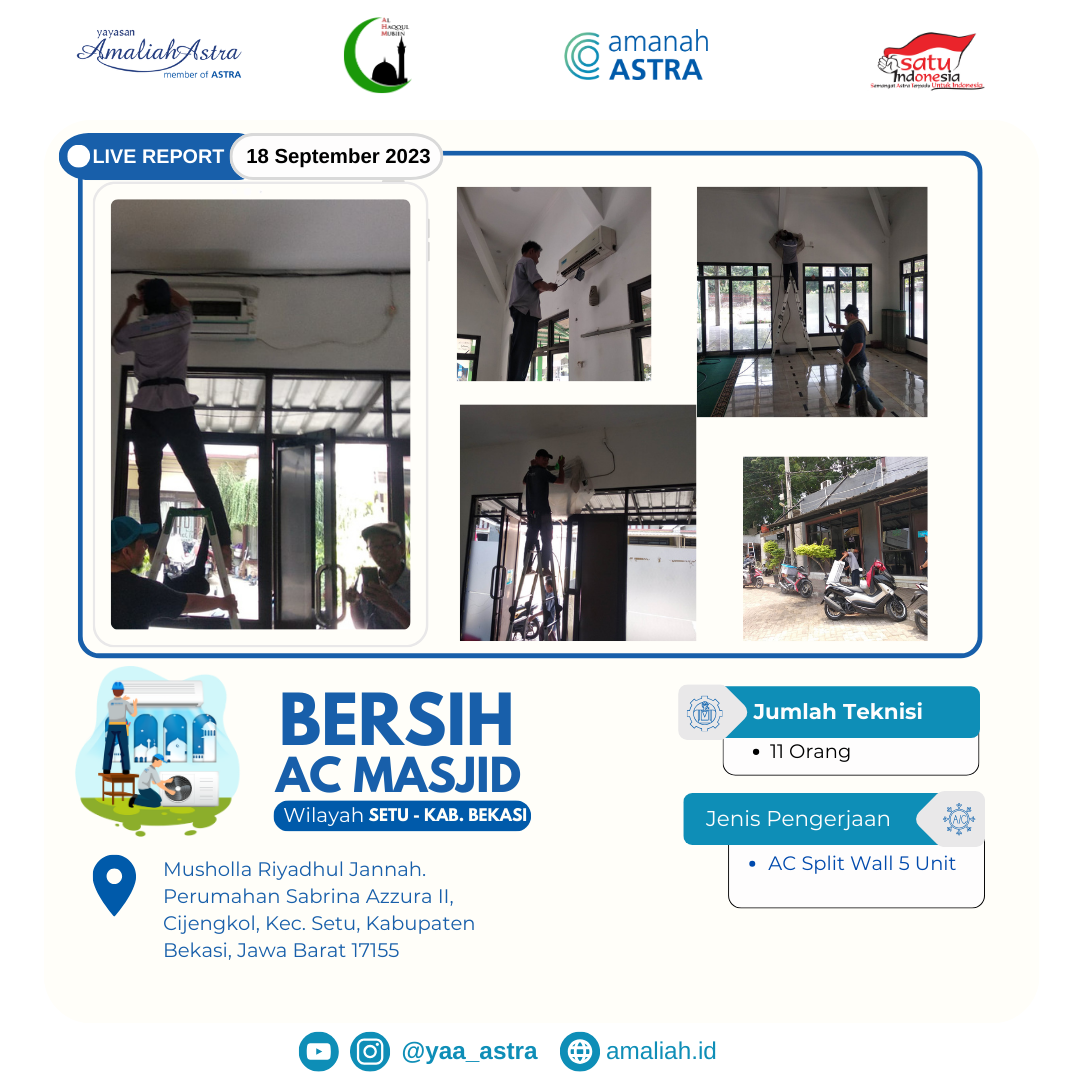 AC Split Wall 5 unit:Telah dibersihkan yang terletak di Musholla Riyadhul Jannah. Perumahan Sabrina Azzura II, Cijengkol, Kec. Setu, Kabupaten Bekasi, Jawa Barat 17155 , InshaAllah 200 jamaah akan mendapatkan manfaat dari kesejukan hembusan AC saat beribadah Sholat 5 waktu.