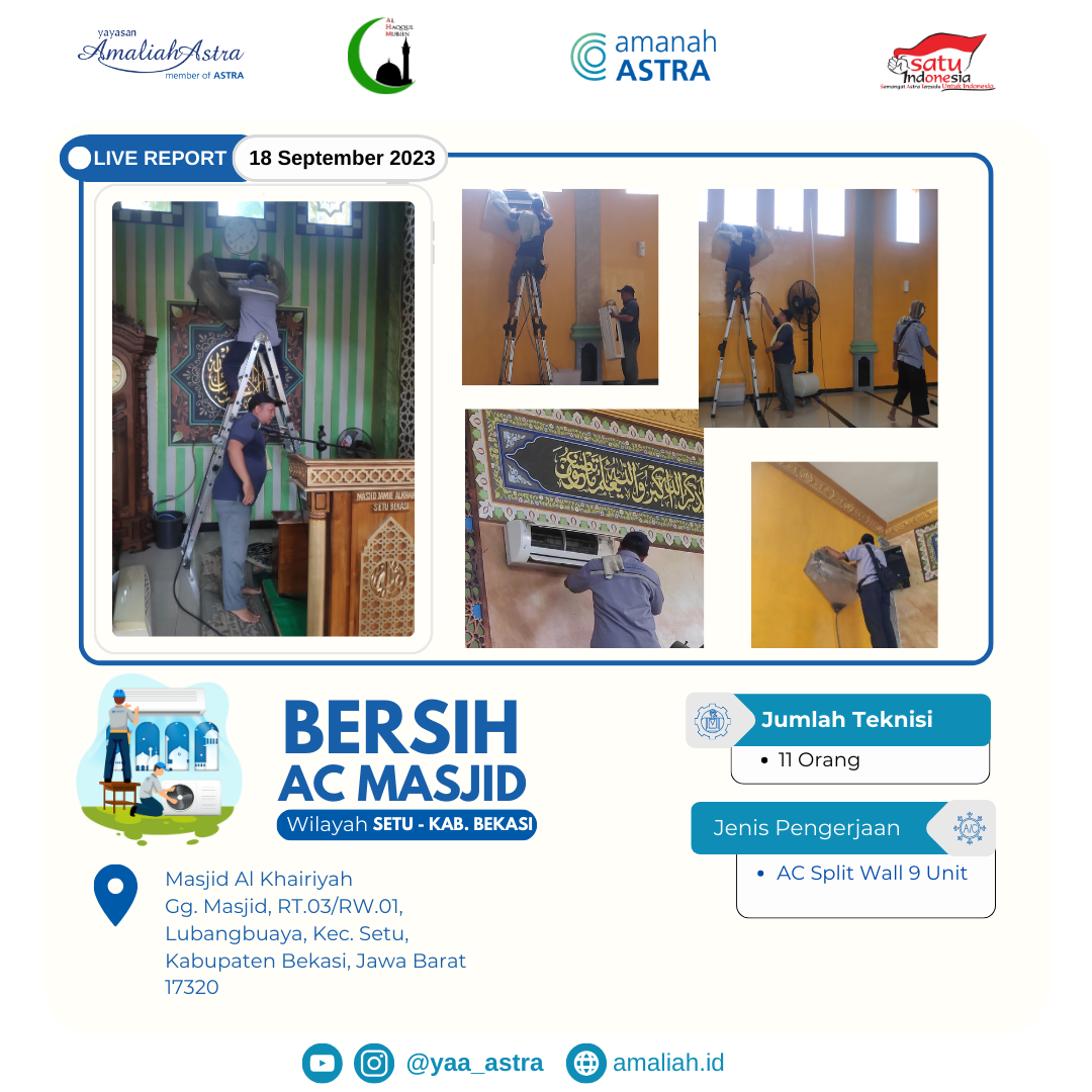 AC Split Wall 9 unit:Telah dibersihkan yang terletak di Masjid Al Khairiyah Gg. Masjid, RT.03/RW.01, Lubangbuaya, Kec. Setu, Kabupaten Bekasi, Jawa Barat 17320, InshaAllah 350 jamaah akan mendapatkan manfaat dari kesejukan hembusan AC saat beribadah Sholat 5 waktu.