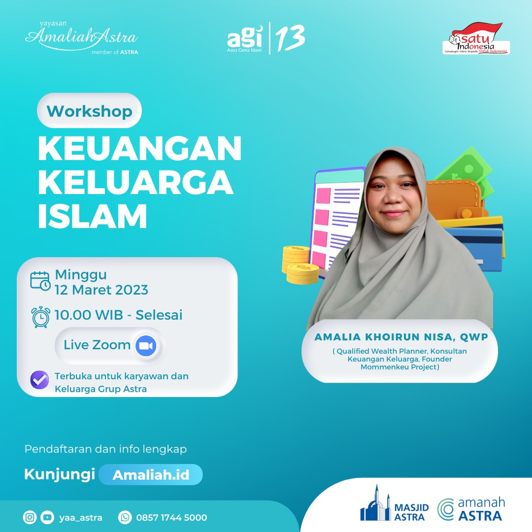 Mungkin banyak dari kita yang masih belum mengetahui tentang konsep rezeki dalam Islam. Esensi pemasukan, pengeluaran, dan Financial Check Up serta pengelolaan dasar keuangan keluarga Islam. Nah, dalam sesi workshop ini kita akan membahas langsung nih seputar tema tersebut. Tentunya akan ada sesi tanya jawab langsung kepada narasumber yang merupakan konsultan keuangan keluarga.Mari catat tanggal dan waktunya Workshop Keluarga Islam: