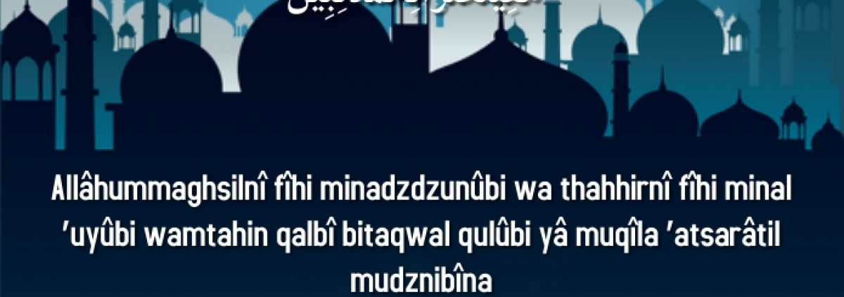 Ya Allah, sucikanlah aku dari dosa-dosa dan bersihkanlah diriku dari segala aib/kejelekan.Tanamkanlah ketakwaan di dalam hatiku, Wahai Penghapus kesalahan orang-orang yang berdosa.Ya Allah, sucikanlah aku dari dosa-dosa dan bersihkanlah diriku dari segala aib/kejelekan.Tanamkanlah ketakwaan di dalam hatiku, Wahai Penghapus kesalahan orang-orang yang berdosa.