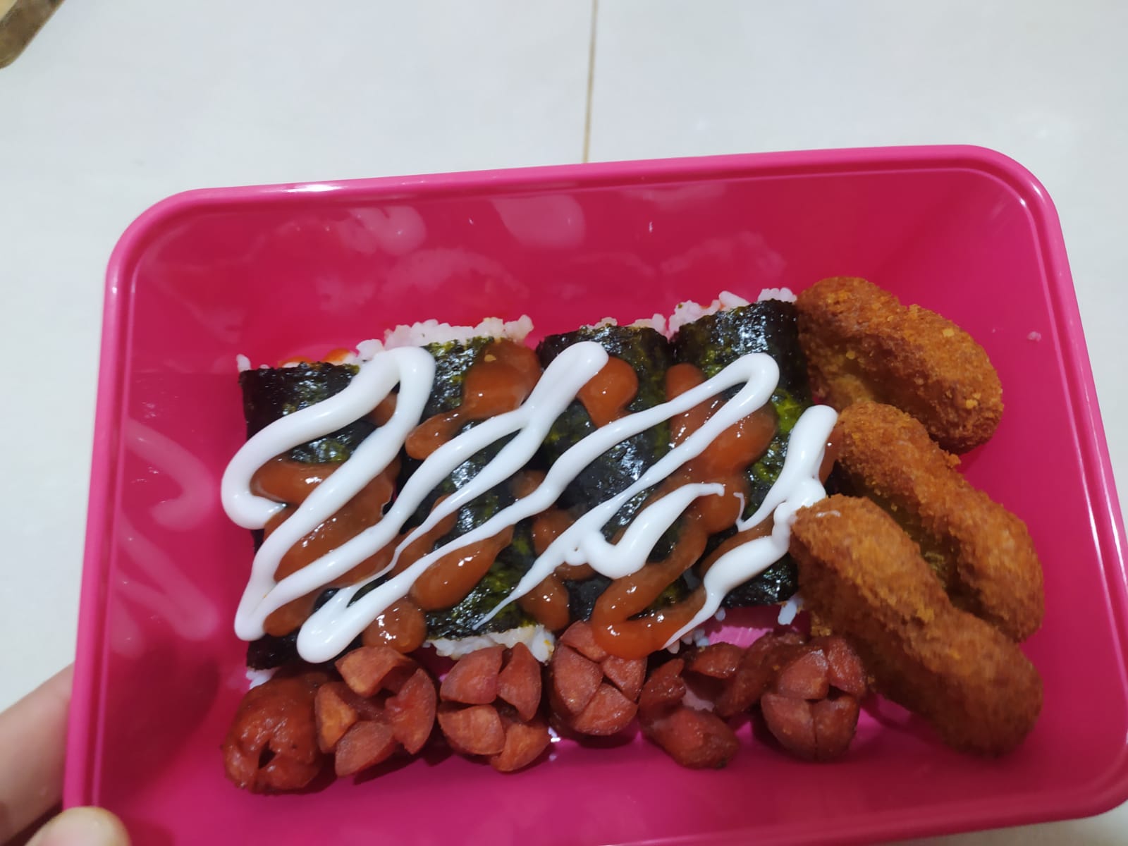 7. Susun bento nori kedalam tempat bekel, masukan sosis dan nugget