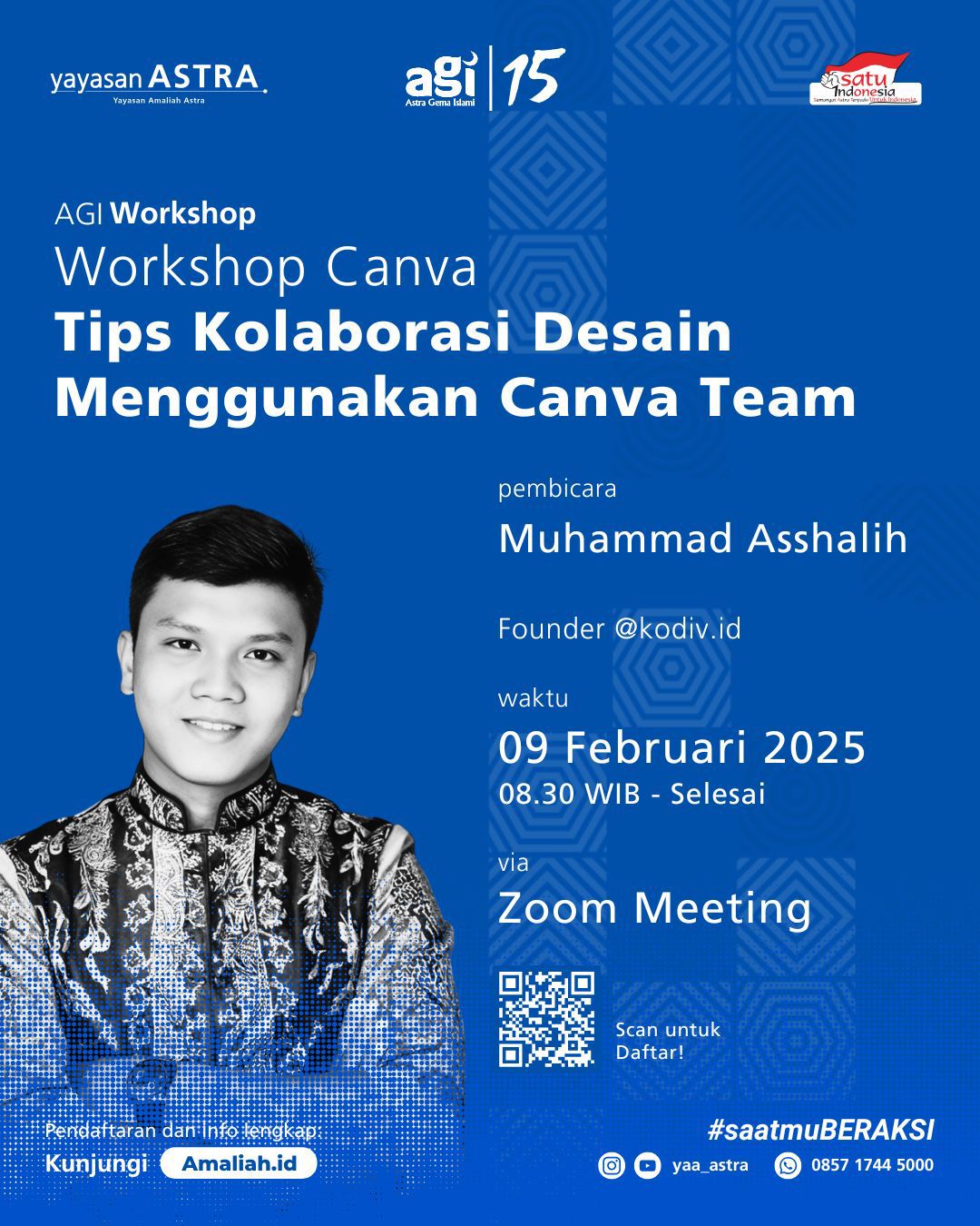 Di workshop Canva ini, kita bakal bahas cara-cara gampang untuk kerja bareng pakai Canva Team. Mulai dari sharing template, diskusi ide, sampai ngehasilin desain keren bareng, semuanya bakal dibahas tuntas. Yuk, join dan rasakan kemudahan kolaborasi bareng nasarumber handal. Catat tanggalnya:🗓 Hari/tanggal: Minggu, 09 Februari 2025