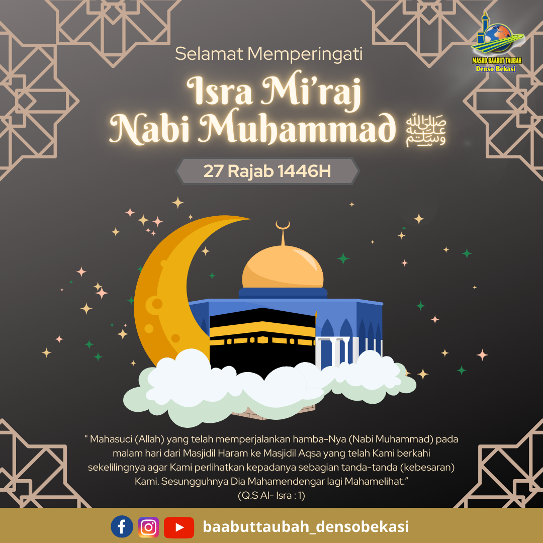 27 Rajab 1446H“Mahasuci (Allah) yang telah memperjalankan hamba-Nya (Nabi Muhammad) pada malam hari dari Masjidil Haram ke Masjidil Aqsa yang telah Kami berkahi sekelilingnya agar Kami perlihatkan kepadanya sebagian tanda-tanda (kebesaran) Kami. Sesungguhnya Dia Mahamendengar lagi Mahamelihat.”
