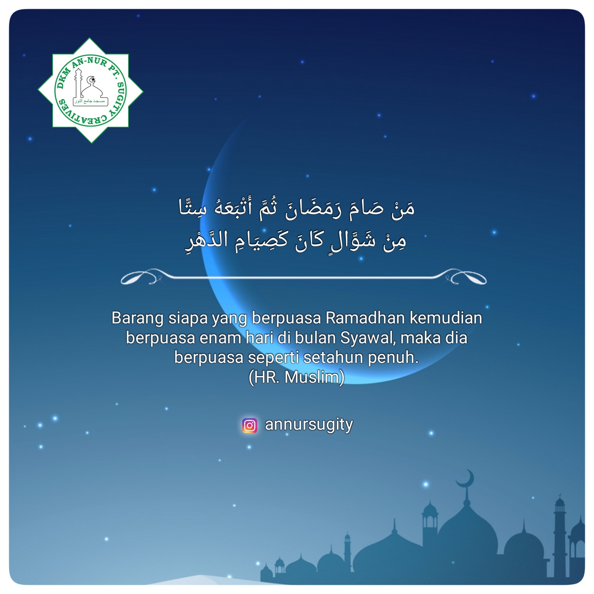 “Barang siapa yang berpuasa Ramadhan kemudian berpuasa enam hari di bulan Syawal, maka dia berpuasa seperti setahun penuh.”