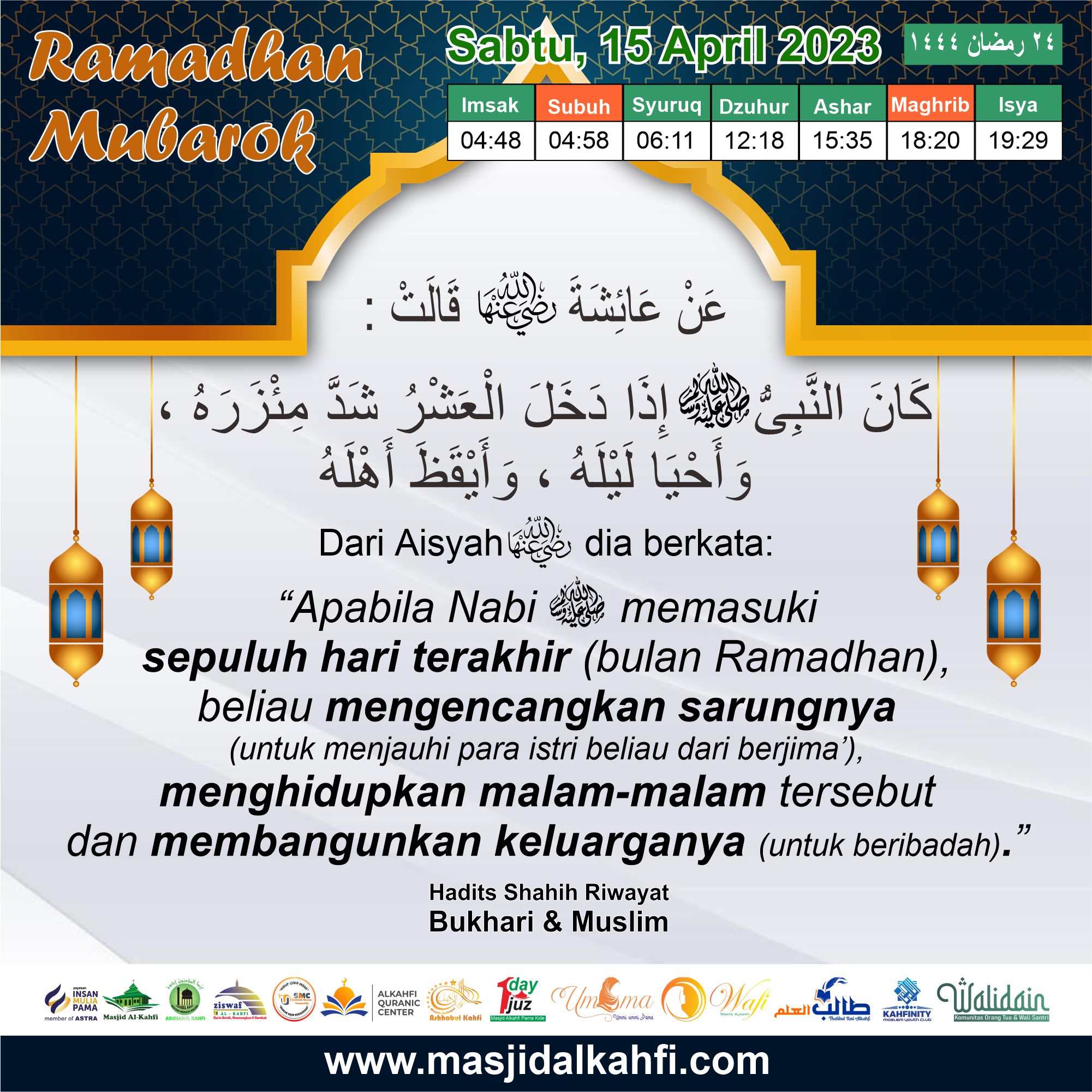 โApabila Nabi shallallahu โalaihi wa sallam memasuki sepuluh hari terakhir (bulan Ramadhan), beliau mengencangkan sarungnya (untuk menjauhi para istri beliau dari berjimaโ), menghidupkan malam-malam tersebut dan membangunkan keluarganya.โ (HR. Bukhari, no. 2024 dan Muslim, no. 1174).