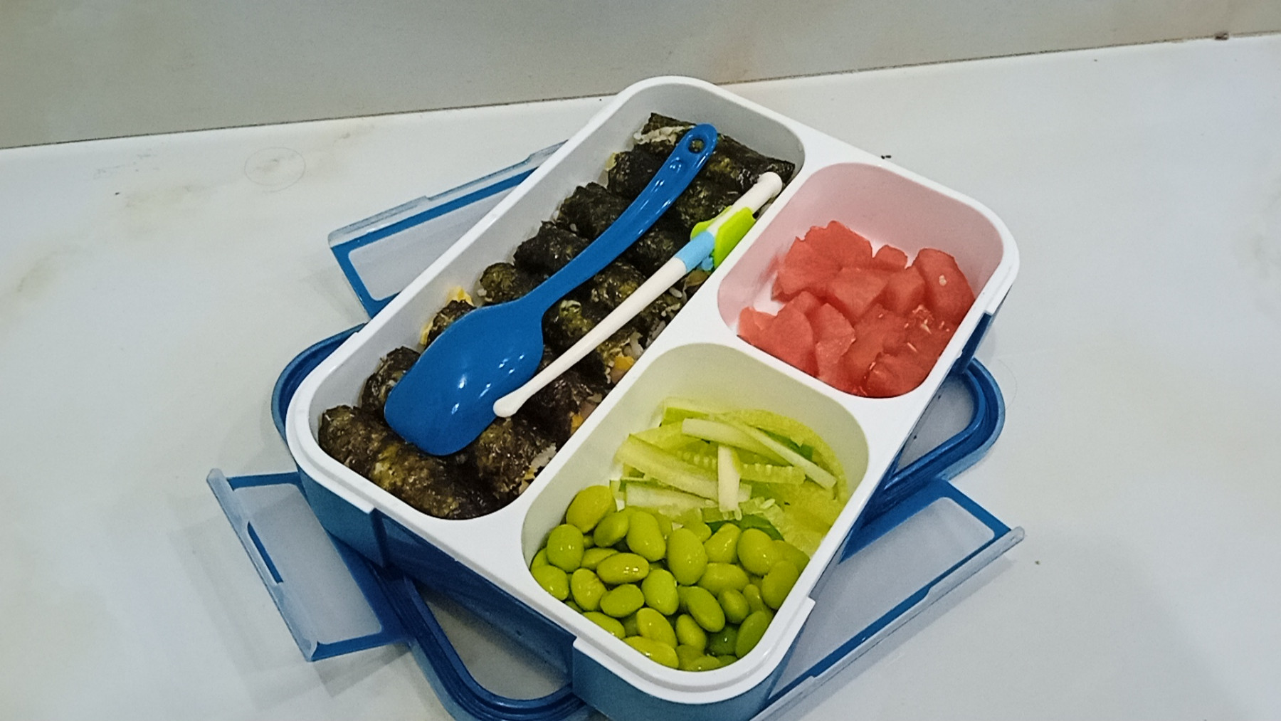 Letakan nasi diatas nori lalu tumpuk dengan irisan sosis telur dan mentimun lalu gulung dengan penggulung Sushi atau dengan bantuan plastik dan padat kan