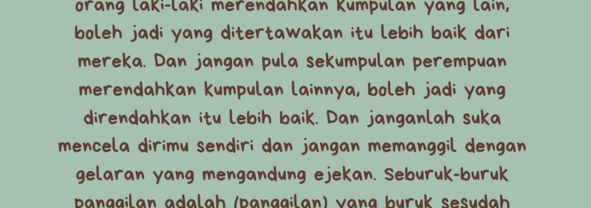 Hai orang-orang yang beriman, janganlah sekumpulan orang laki-laki merendahkan kumpulan yang lain, boleh jadi yang ditertawakan itu lebih baik dari mereka. Dan jangan pula sekumpulan perempuan merendahkan kumpulan lainnya, boleh jadi yang direndahkan itu lebih baik. Dan janganlah suka mencela dirimu sendiri dan jangan memanggil dengan gelaran yang mengandung ejekan. Seburuk-buruk panggilan adalah (panggilan) yang buruk sesudah iman dan barangsiapa yang tidak bertobat, maka mereka itulah orang-orang yang zalim.