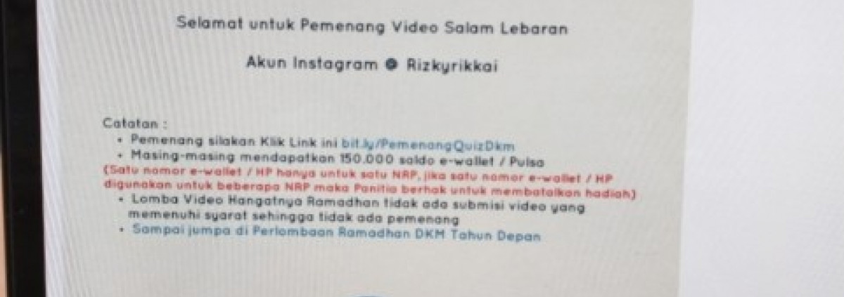 Alhamdulillah di DKM kami sudah berada dipucuk event kegiatan Ramadhan yang sebentar lagi berakhir. Btw ini merupakan pengumuman lomba video salam lebaran yang beberapa event kami sesuaikan dengan agenda AGI 2022. Harapannya agar karyawan terpacu mengikuti lomba ini & berpeluang mendapatkan hadiah yang lebih banyak lagi.