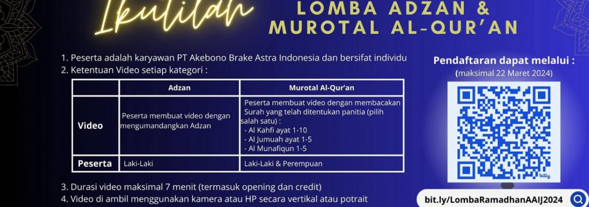 Untuk menyemarakkan Ramadhan 1445 H PT Akebono Brake Astra Indonesia, mari kita berlomba lomba dalam kebaikan dengan mengikuti Lomba Adzan & Murotal Al-Quran
