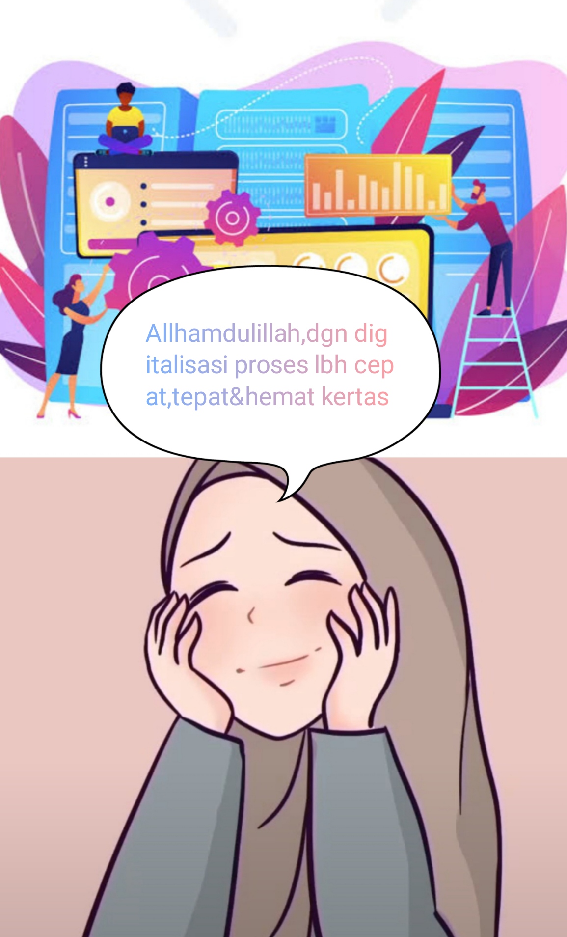 Comic sholeha series slide 5Dua pekan berlalu, atas ijin Allah kesehatan berangsur-angsur membaik, saat dua pekan dirumah menjadikan muhasabah diri untuk memperbaiki hubungannya dengan Sang pemilik segalanya dan ketika ia mulai bekerja wfo (masuk kantor) allah berikan jalan & solusi atas pekerjaannya melalui sistem digitalisasi yang perlahan diterapkan didalam pekejaannya.