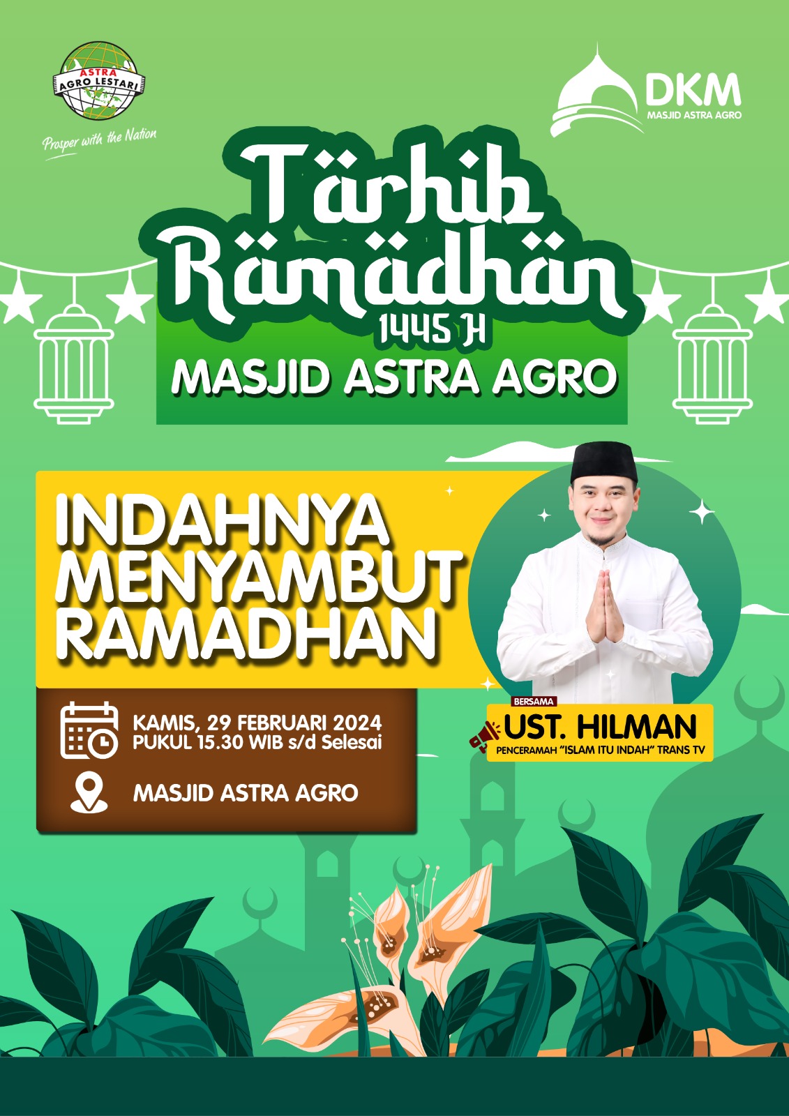 Waktu: 15.30 WIBAcara Tarhib Ramadhan ini akan diisi dengan tausiyah oleh Ustadz Hilman, Penceramah acara "Islam Itu Indah" Trans TV