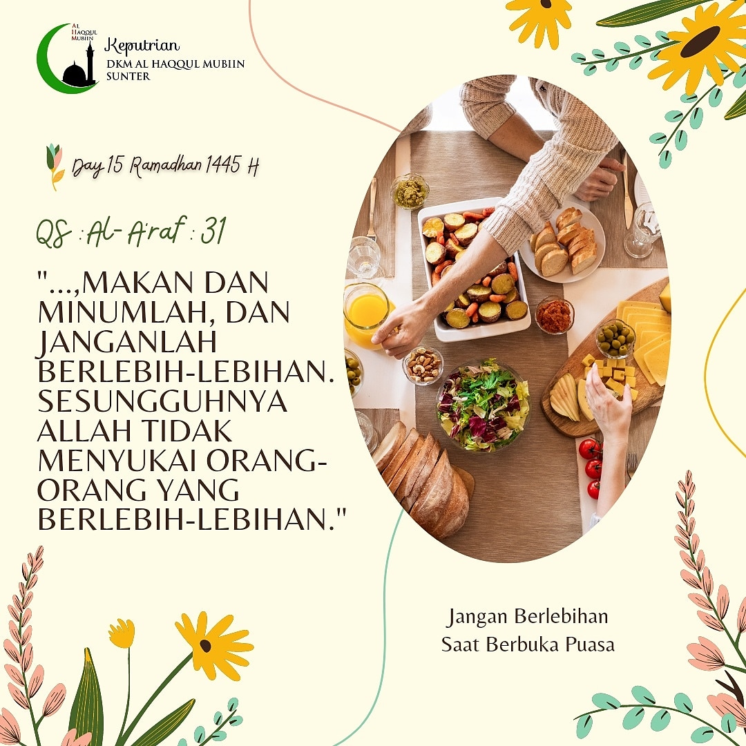 Hai anak Adam, pakailah pakaianmu yang indah di setiap (memasuki) mesjid, makan dan minumlah, dan janganlah berlebih-lebihan. Sesungguhnya Allah tidak menyukai orang-orang yang berlebih-lebihan.