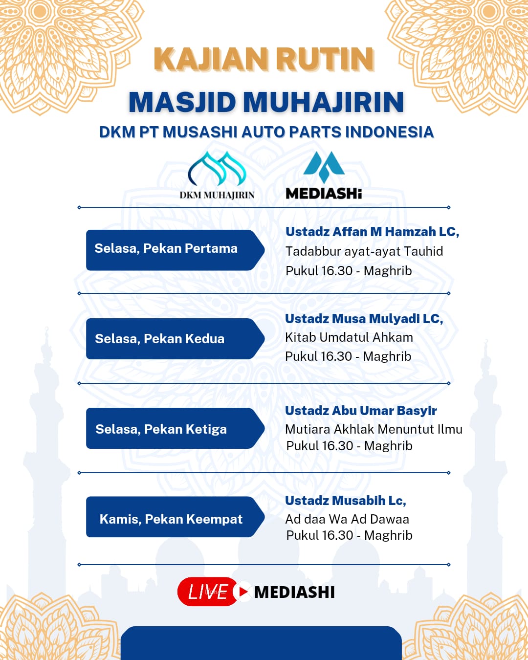 2 tahun yang lalu PublikJadwal Kajian Rutin DKM Muhajirin PT Musashi Auto Parts Indonesia,