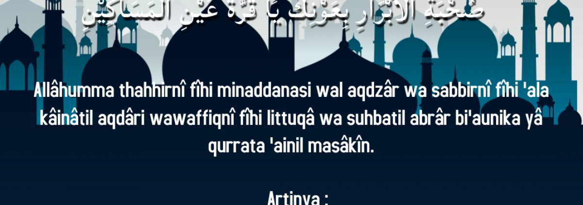Ya Allah, mohon sucikanlah diri kami di bulan ini dari segala nista dan perbuatan keji. Berilah aku kesabaran atas apa yang telah Engkau tetapkan. Anugerahkan kepada kami ketakwaan dan persahabatan dengan orang-orang yang baik dengan pertolongan-Mu, wahai cahaya hati orang-orang yang miskin.Ya Allah, mohon sucikanlah diri kami di bulan ini dari segala nista dan perbuatan keji. Berilah aku kesabaran atas apa yang telah Engkau tetapkan. Anugerahkan kepada kami ketakwaan dan persahabatan dengan orang-orang yang baik dengan pertolongan-Mu, wahai cahaya hati orang-orang yang miskin.