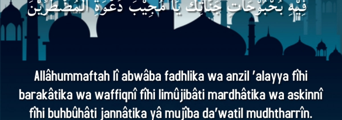 Ya Allah bukakanlah lebar-lebar pintu karunia-Mu di bulan ini dan curahkan berkah-berkah-Mu. Tempatkan aku di tempat yang membuat-Mu rida padaku. Tempatkan aku di dalam Surga-Mu, Wahai Yang Maha menjawab doa orang yang dalam kesempitan.