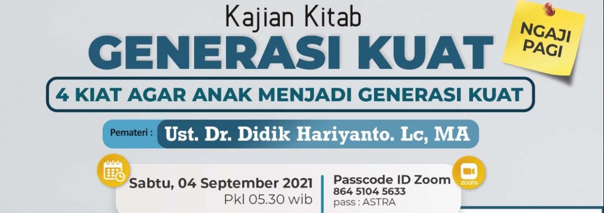 Pengasuhan Anak Berdasarkan Al-Qur'an | Dr. Didik Hariyanto. MA Sabtu, 4 September 2021 - 05:30 WIB Join Zoom Meeting https://us02web.zoom.us/j/86451045633?pwd=cW55YUV0SFdmNEdhY21wdlBTem12Z… Meeting ID: 864 5104 5633 Passcode: ASTRA