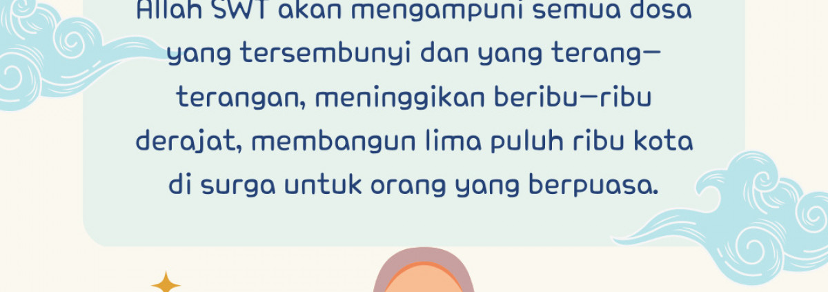 Allah SWT akan mengampuni semua dosa yang tersembunyi dan yang terang-terangan, meninggikan beribu-ribu derajat, membangun lima puluh ribu kota di surga untuk orang yang berpuasa.Hari ke-1:  Allah SWT akan mengampuni semua dosa yang tersembunyi dan yang terang-terangan, meninggikan beribu-ribu derajat, membangun lima puluh ribu kota di surga untuk orang yang berpuasa.