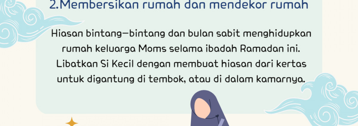 Hiasan bintang-bintang dan bulan sabit menghidupkan rumah keluarga Moms selama ibadah Ramadan ini. Libatkan Si Kecil dengan membuat hiasan dari kertas untuk digantung di tembok, atau di dalam kamarnya.Agi2023