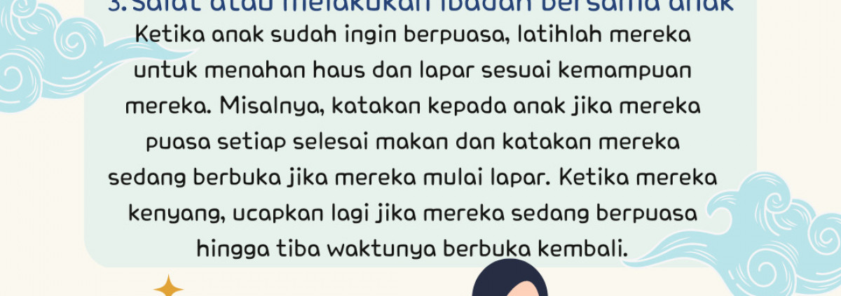 Ketika anak sudah ingin berpuasa, latihlah mereka untuk menahan haus dan lapar sesuai kemampuan mereka. Misalnya, katakan kepada anak jika mereka puasa setiap selesai makan dan katakan mereka sedang berbuka jika mereka mulai lapar. Ketika mereka kenyang, ucapkan lagi jika mereka sedang berpuasa hingga tiba waktunya berbuka kembali.
