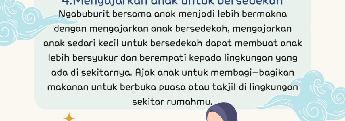 Ngabuburit bersama anak menjadi lebih bermakna dengan mengajarkan anak bersedekah, mengajarkan anak sedari kecil untuk bersedekah dapat membuat anak lebih bersyukur dan berempati kepada lingkungan yang ada di sekitarnya. Ajak anak untuk membagi-bagikan makanan untuk berbuka puasa atau takjil di lingkungan sekitar rumahmu.