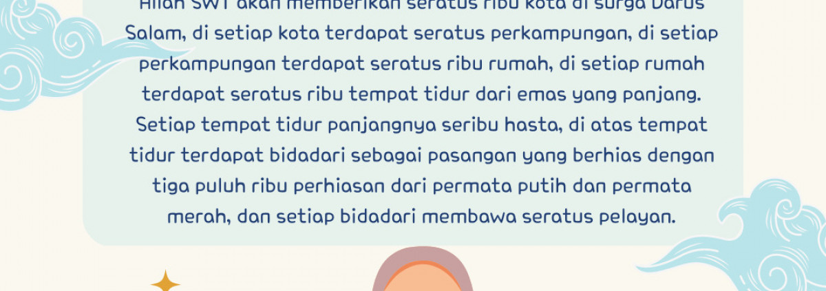 Allah SWT akan memberikan seratus ribu kota di surga Darus Salam, di setiap kota terdapat seratus perkampungan, di setiap perkampungan terdapat seratus ribu rumah, di setiap rumah terdapat seratus ribu tempat tidur dari emas yang panjang. Setiap tempat tidur panjangnya seribu hasta, di atas tempat tidur terdapat bidadari sebagai pasangan yang berhias dengan tiga puluh ribu perhiasan dari permata putih dan permata merah, dan setiap bidadari membawa seratus pelayan.