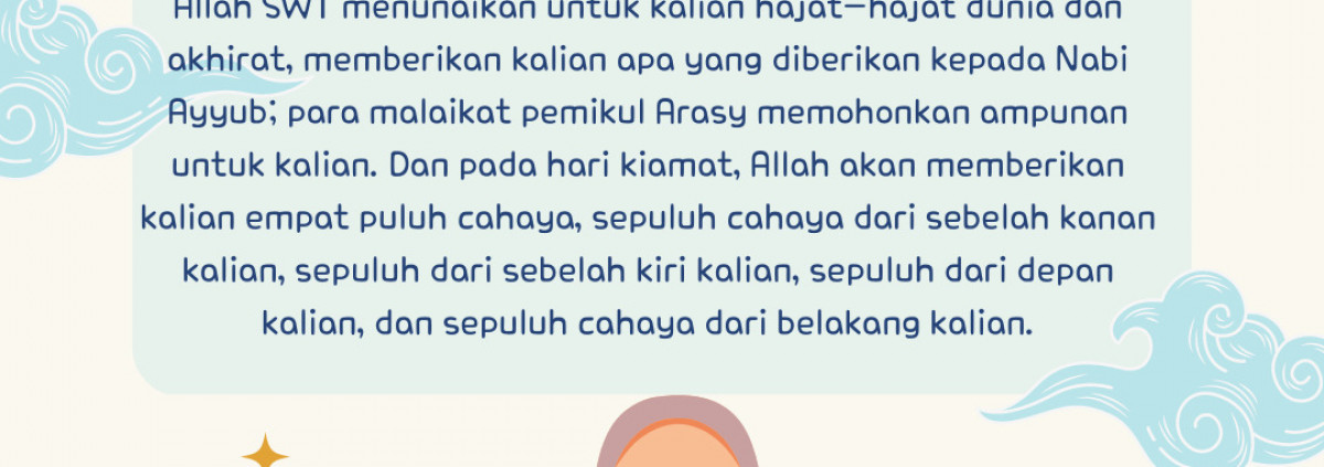 Allah SWT menunaikan untuk kalian hajat-hajat dunia dan akhirat, memberikan kalian apa yang diberikan kepada Nabi Ayyub; para malaikat pemikul Arasy memohonkan ampunan untuk kalian. Dan pada hari kiamat, Allah akan memberikan kalian empat puluh cahaya, sepuluh cahaya dari sebelah kanan kalian, sepuluh dari sebelah kiri kalian, sepuluh dari depan kalian, dan sepuluh cahaya dari belakang kalian.