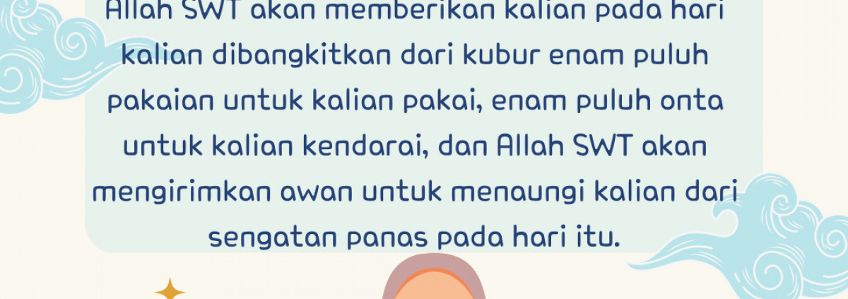 Allah SWT akan memberikan kalian pada hari kalian dibangkitkan dari kubur enam puluh pakaian untuk kalian pakai, enam puluh onta untuk kalian kendarai, dan Allah SWT akan mengirimkan awan untuk menaungi kalian dari sengatan panas pada hari itu.