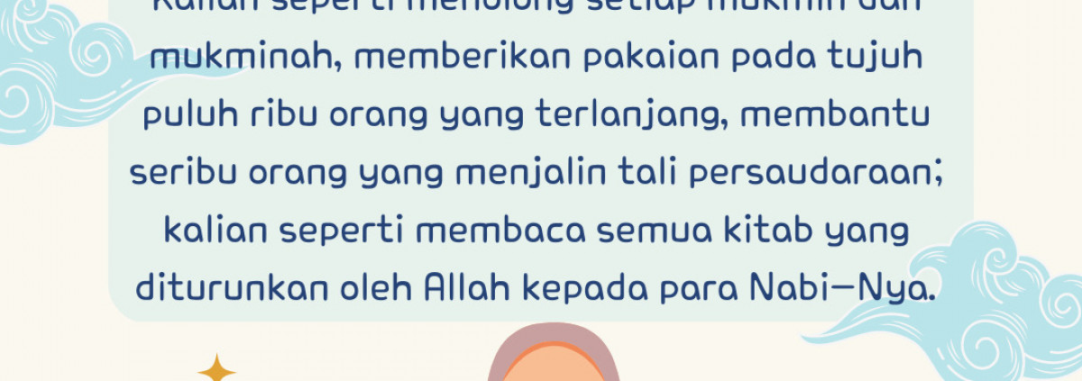 Kalian seperti menolong setiap mukmin dan mukminah, memberikan pakaian pada tujuh puluh ribu orang yang terlanjang, membantu seribu orang yang menjalin tali persaudaraan; kalian seperti membaca semua kitab yang diturunkan oleh Allah kepada para Nabi-Nya.