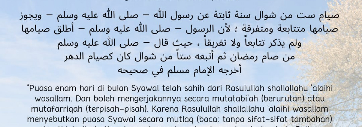 Tidak sebagaimana puasa Ramadan, puasa Syawal tidak disyaratkan harus berurutan (mutatabi’ah) dalam pelaksanaannya. Boleh dilakukan secara terpisah-pisah (mutafarriqah) harinya.