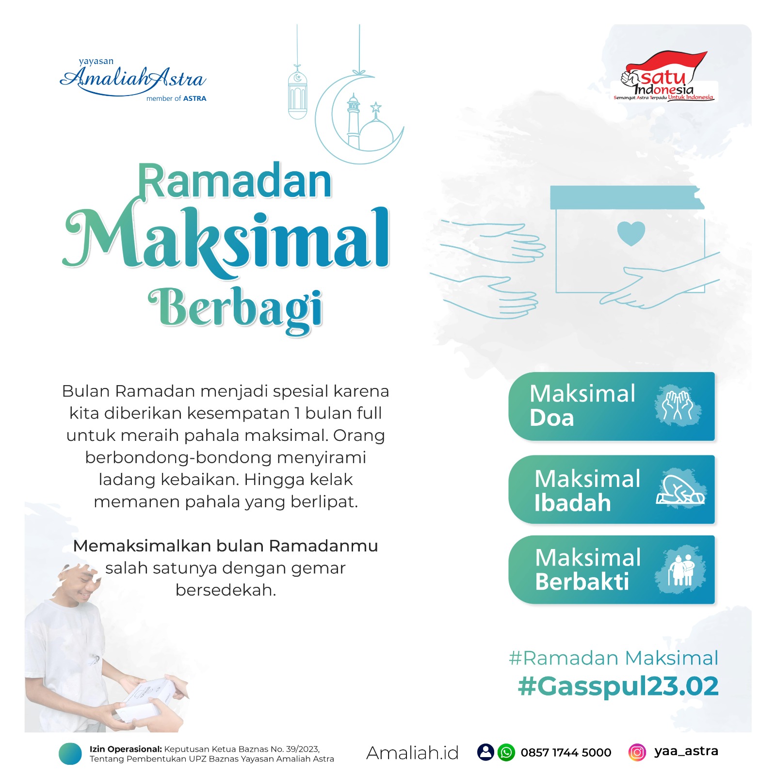 Yayasan Amaliah Astra mengirim 1 tahun yang lalu PublikRamadan Maksimal Berbagi Bulan Ramadan jadi spesial karena kita diberikan kesempatan 1 bulan full untuk meraih pahala maksimal. Yuk! kita berbondong-bondong menyirami ladang kebaikan. Hingga kelak memanen pahala yang berlipat. Memaksimalkan bulan Ramadan salah satunya dengan gemar bersedekah. Mulai dengan berbagi makanan berbuka menjelang maghrib, berwakaf Al Qur’an dan lainnya. Maksimal berbagi, maksimal berkahnya. #RamadanMaksimal #Gasspul23.02