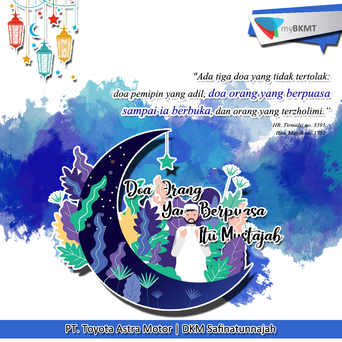 Ada tiga doa yang tidak tertolak yaitu, doa pemimpin yang adil, doa orang berpuasa dan doa orang yang terdzolimi. (HR. Tirmidzi No.) 3595 Perusahaan Grup Astra TOYOTA Wilayah Grup Astra Purwakarta/Subang/Karawang