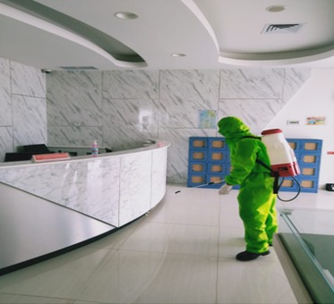 Seperti yang terlihat pada (3/5) terlihat petugas penyemprotan disinfektan sedang melakukan penyemprotan lengkap dengan APD yang ia kenakan. Petugas ini secara bergantian setiap akhir produksi untuk melakukan penyemprotan di seluruh area gedung. -SP