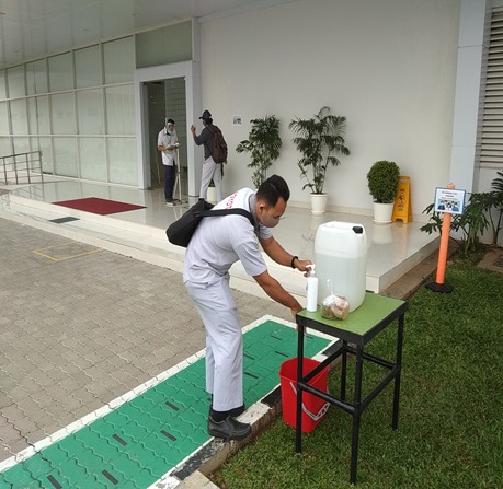 Alur untuk masuk ke area kerja diawali dengan security mencatat nomor polisi kendaraan, kemudian karyawan di arahkan untuk mencuci tangan  dan dicek suhu tubuh.