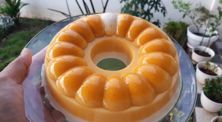 Campurkan semua bahan puding susu kemudian panaskan dan tuang diatas cetakan yang sudah ada layer pertama