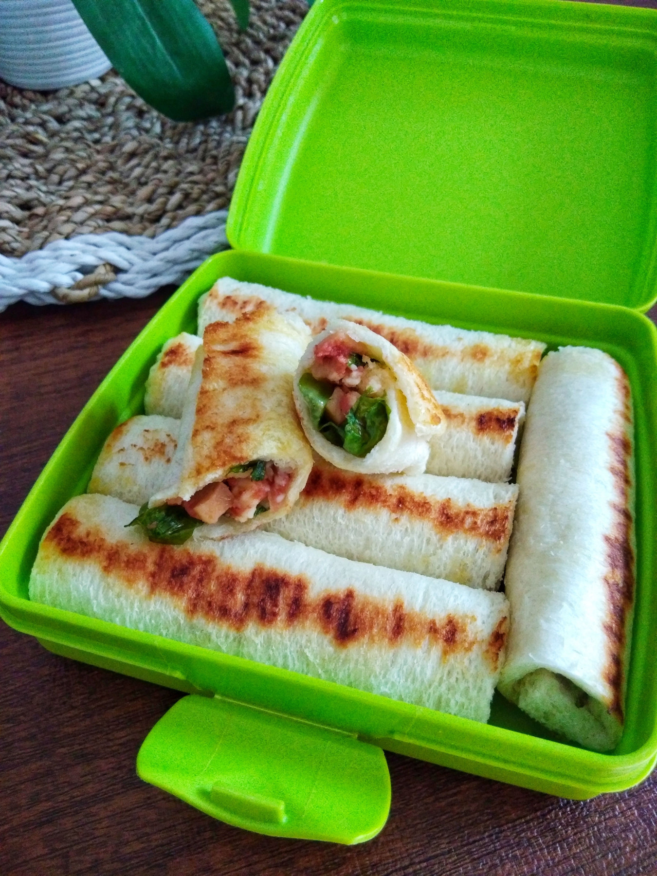 3. Pipihkan roti tawar dengan rolling pin, lalu masukan bahan isian mulai dari salada, kornet, keju parut (jika suka boleh pakai mayoinaise dan saus²)