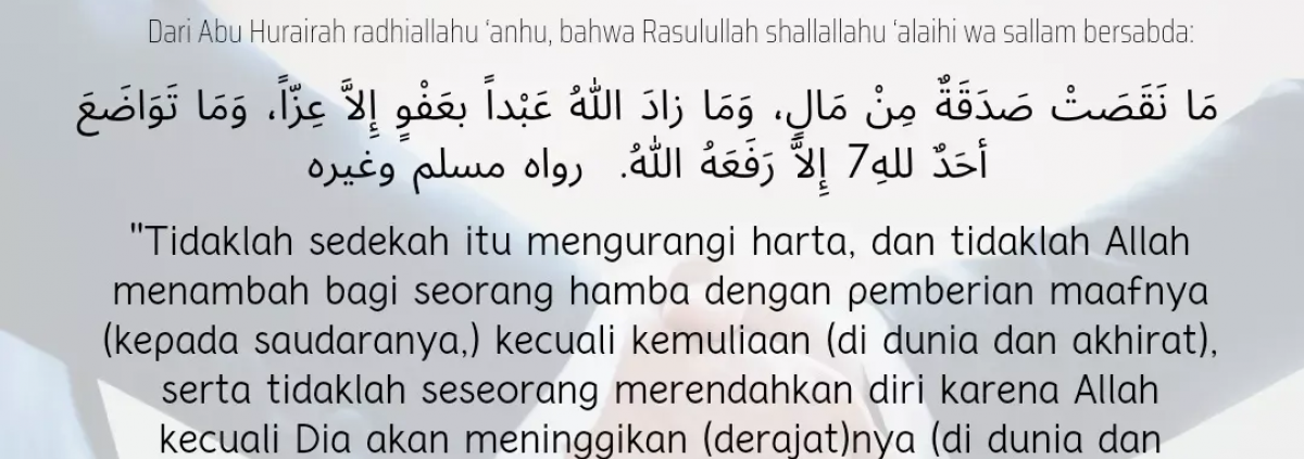 Bersedekah tidak akan mengurangi harta kita. Saling memaafkan akan menambah kemuliaan. Dan sesungguhnya orang yang tawadhu akan dinaikan derajatnya oleh Allah baik di dunia maupun di akhirat.