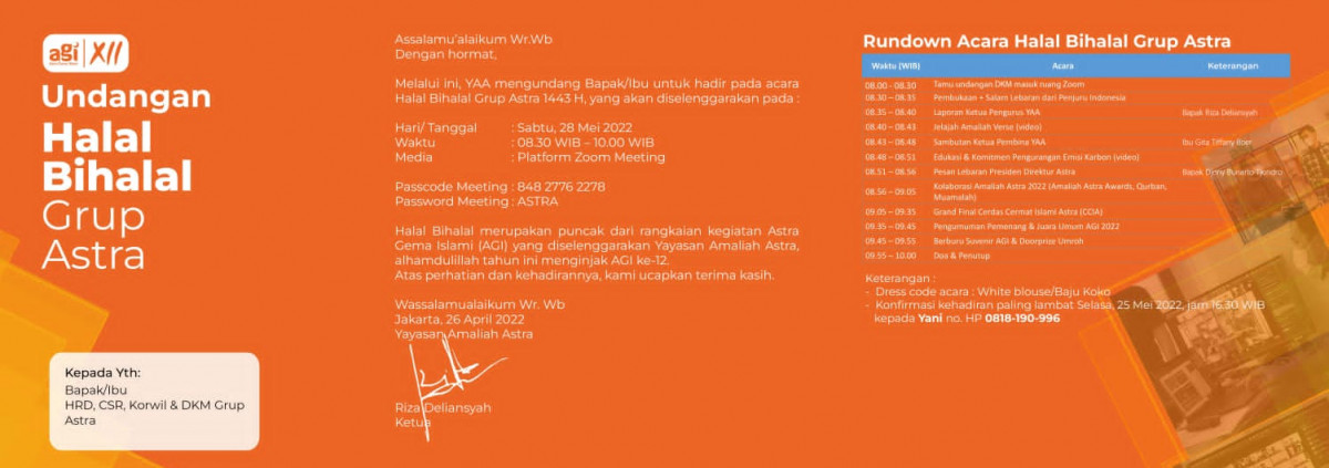 Salam teriring doa, semoga Bapak/Ibu dalam keadaan sehat wal afiat. Melalui ini, Yayasan Amaliah Astra mengundang Bapak/Ibu untuk hadir pada acara Halal Bihalal Grup Astra 1443H, yang akan diselenggarakan pada: