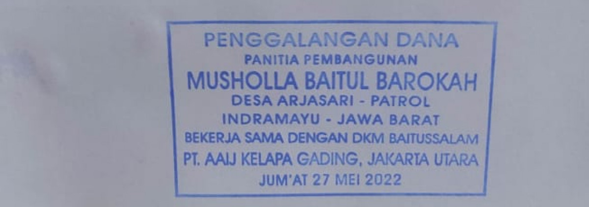 Pada Jumat, 26 Syawal 1443 H bertepatan dengan 27 Mei 2022, DKM Baitussalam bekerja sama dengan Panitia Pembangunan Musholla Baitul Barokah, mengundang jamaah Masjid Baitussalam untuk kembali menginfakkan hartanya guna pembangunan Musholla yang berlokasi di Desa Arjasari, Patrol, Indramayu, Jawa Barat. Musholla ini merupakan rekomendasi dari salah satu karyawan yaitu Bp. Akhmad Jajuli dari Departemen Workshop. Adapun total infak pembangunan mushola yang terkumpul yaitu sebesar Rp5.443.500,- (Lima juta empat ratus empat puluh tiga ribu lima ratus rupiah), yang langsung diserahkan kepada Bp. Akhmad Jajuli sebagai perwakilan Musholla Baitul Barokah.