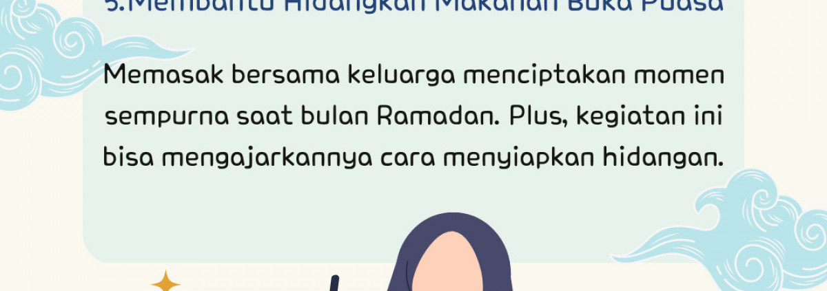 Membantu Hidangkan Makanan Buka Puasa Memasak bersama keluarga menciptakan momen sempurna saat bulan Ramadan. Plus, kegiatan ini bisa mengajarkannya cara menyiapkan hidangan.