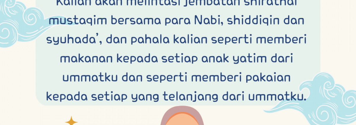 Kalian akan melintasi jembatan shirathal mustaqim bersama para Nabi, shiddiqin dan syuhada’, dan pahala kalian seperti memberi makanan kepada setiap anak yatim dari ummatku dan seperti memberi pakaian kepada setiap yang telanjang dari ummatku.