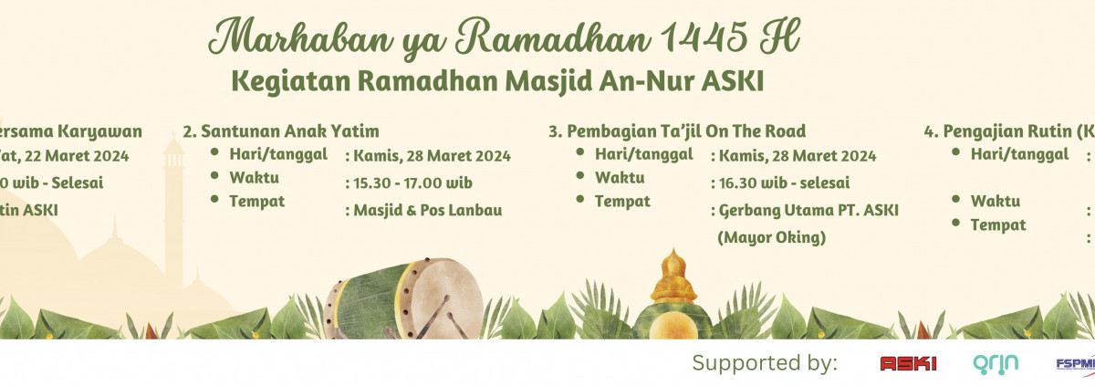 Saya dari DKM An Nur, izin menyampaikan beberapa informasi tentang Rencana Kegiatan DKM An Nur ASKI di bulan Ramadhan 1445 H. Hasil pertemuan antara Pengurus DKM, Perwakilan Manajemen/HRD dan Perwakilan Serikat Pekerja ASKI maka disepakatilah beberapa Rencana Kegiatan kita di bulan Ramadhan tahun 2024 adalah sebagai berikut :