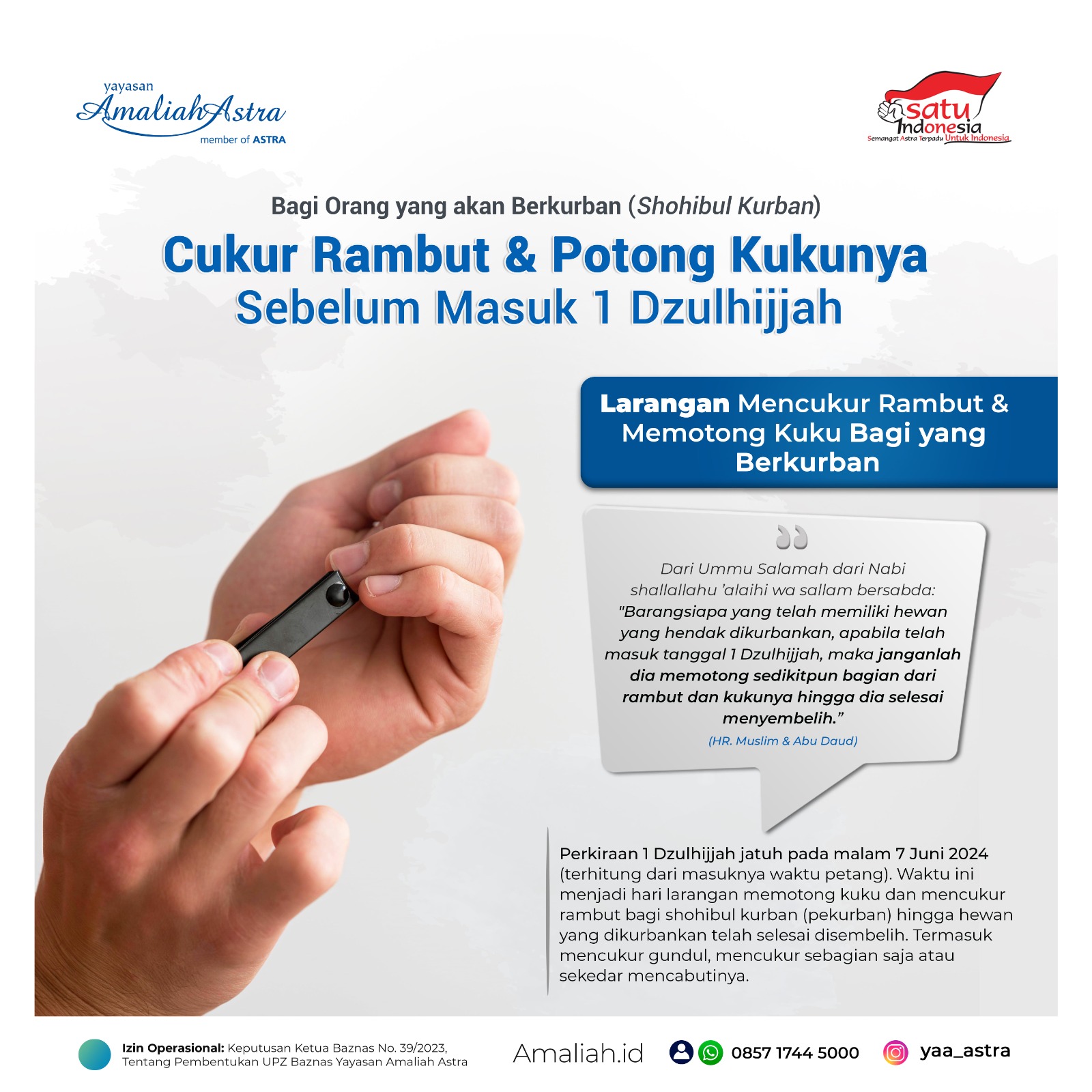Salah satunya tidak mencukur rambut dan memotong kuku setelah masuk tanggal 1 Dzulhijjah. Jadi pastikan tidak melewatkan hal ini ya..