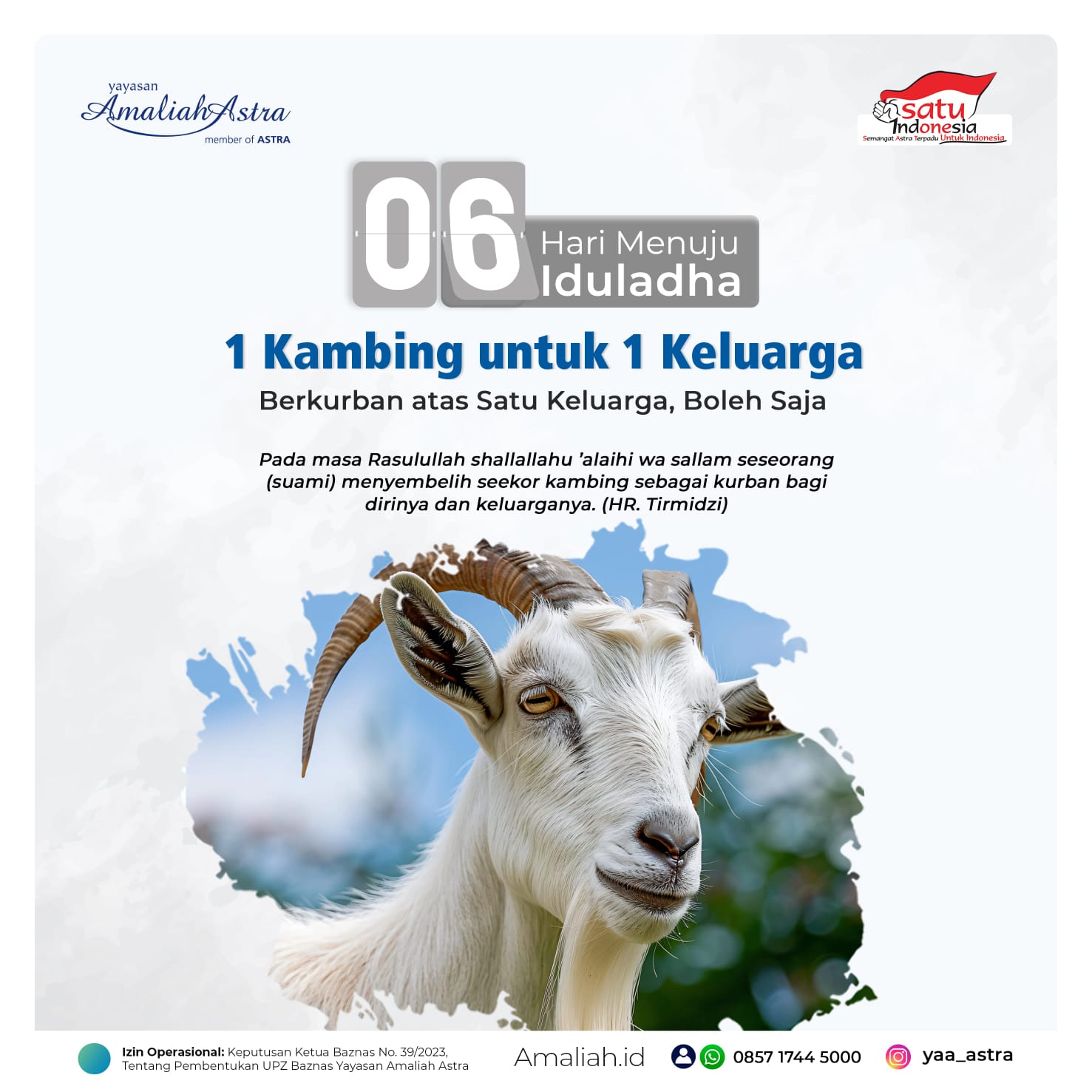 Kurban 1 Kambing atas 1 KeluargaSatu ekor kambing hanya dapat mewakili satu orang atau satu keluarga (yang tinggal satu rumah). Dengan ketentuan memiliki hubungan kekerabatan serta pemberi nafkah yang sama.