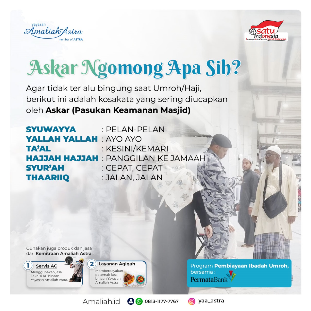 Saat berada di tanah suci, sering kita jumpai orang-orang yang memakai seragam militer, mereka merupakan Askar atau pasukan pengamanan yang bertugas di Masjidil Haram dan Masjid Nabawi. Tidak hanya bertugas mengamankan, Askar juga sering mengatur lalu Lalang jamaah yang beribadah. Agar tidak terlalu bingung apa yang diucapkan oleh Askar, yuk simak berikut ini.